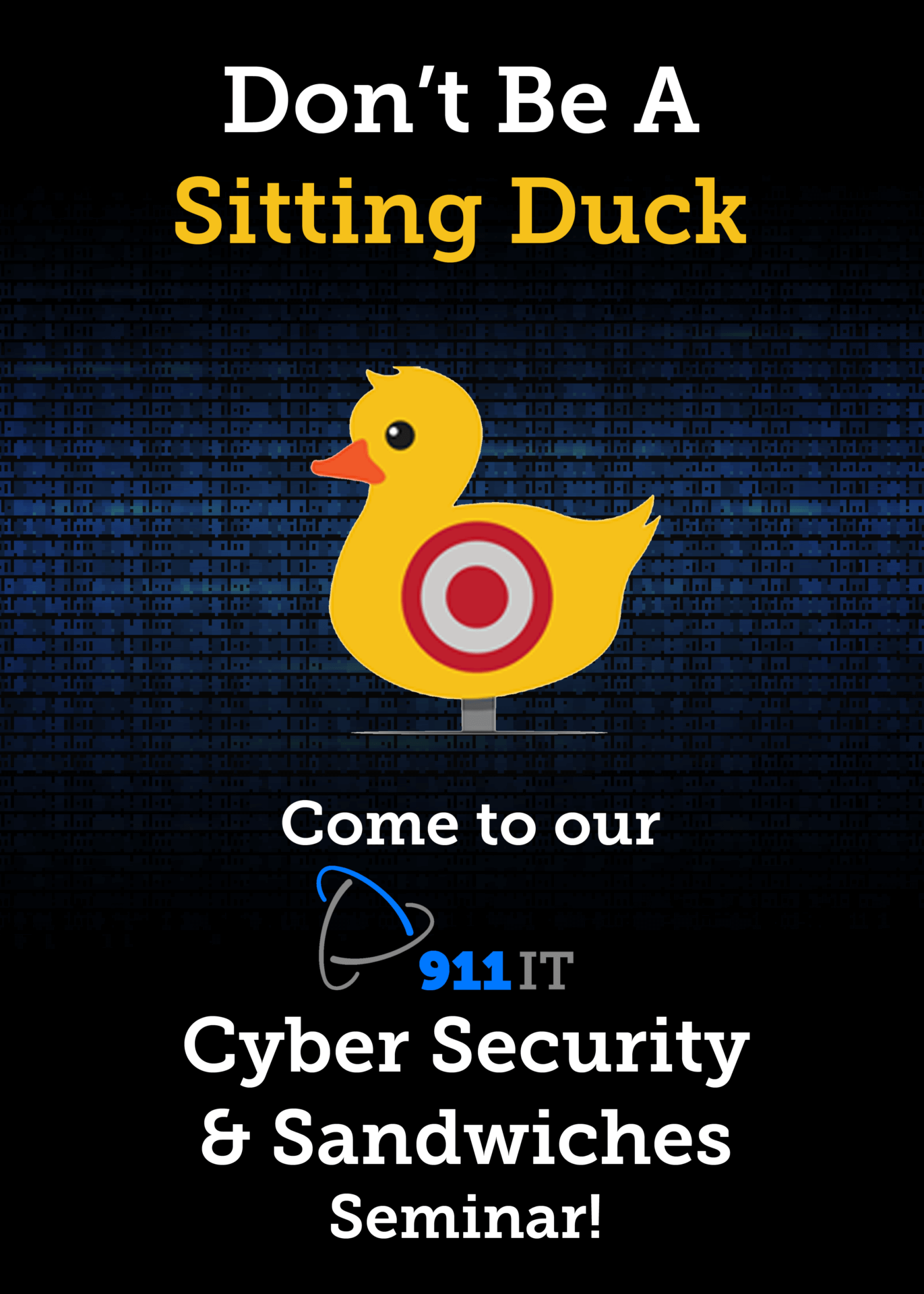 We created an invitation package to our Lunch and Learn event, complete with a rubber duck (See Marketing Example). The letter read, “Don’t Be A Sitting Duck…Come to our Lunch and Learn Seminar!” During these group presentations, we talked about the cyberthreats our clients face today. Then we presented a plan to proactively help protect their businesses from those threats. It WORKED as every single client except one signed up! In fact, most clients signed up right on the spot. Thanks to this campaign, we went from 100% break-fix to 100% recurring revenue MSP clients!